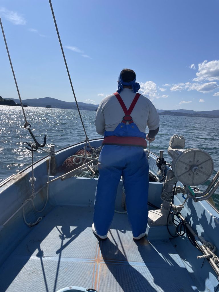 船首にラオウのごとく仁王立ちするこの大男。この人こそ我らが戸倉青年研究会会長です!直前まで吹いていた風も少し落ち着き海に出られて一安心。さてアワビたちはどうなっているのか?